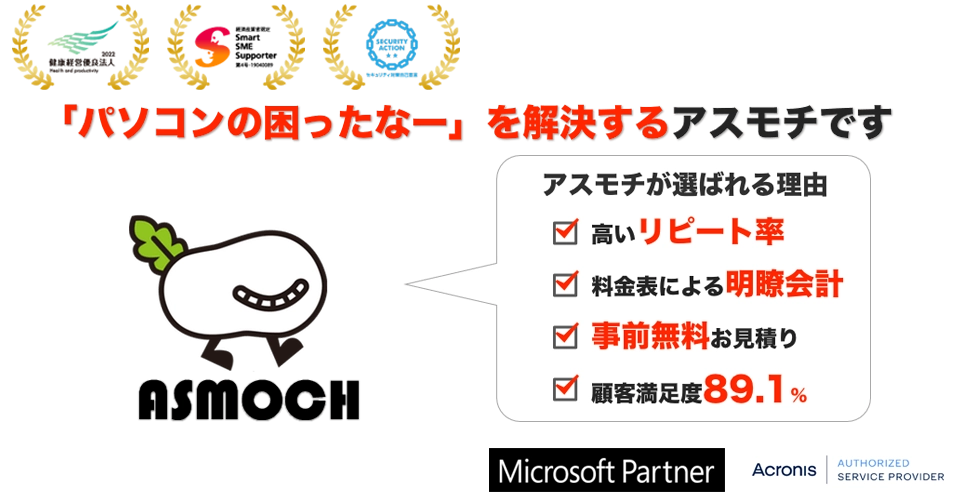 中小事業者様のパソコントラブル等のITトラブルサポートを行っているアスモチ株式会社です。